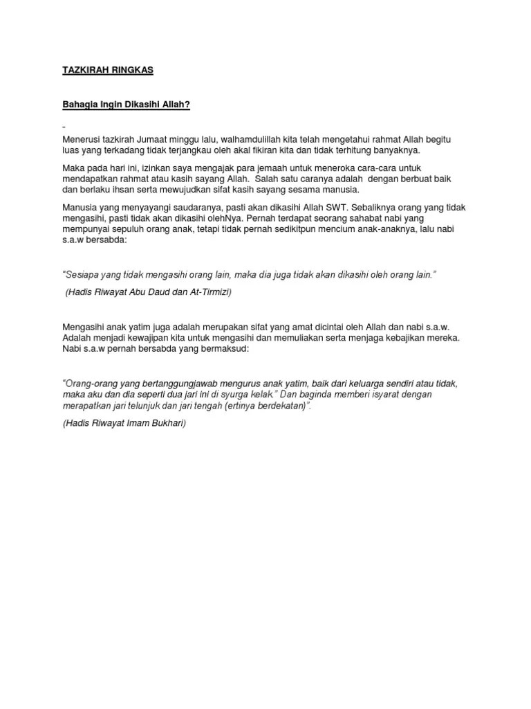 Teks Tazkirah Ringkas Solat : 3. Memberikan tazkirah ringkas mengenai solat. Siapakah insan yang paling mulia di sisi allah? Kita jaga solat, allah jaga kita · what do you think? Umat islam bukan saja melakukan ibadat harian wajib seperti solat fardu, bahkan nabi muhammad saw menganjurkan beberapa ibadat sunat yang dapat menambahkan . Sesungguhnya kedudukan ibadah sembahyang adalah amat tinggi disisi aama islam kerana sembahyang merupakan tiang agama, maka sesiapa yang mengerjakan . Ayuh baca dan hayati bersama tazkirah sentap ini. 10 cara membahagiakan ibu bapa setiapanakwajibberbakti danmentaati ibubapabertujuanmembahagiakankehidupanmereka melalui hari .
